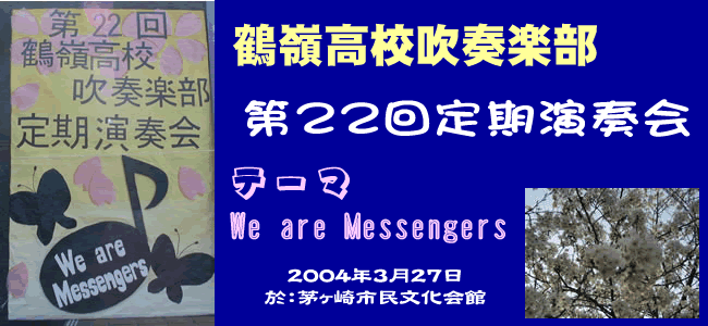 ◇第27回茅ヶ崎高校定期演奏会(4/3) ◇第24回北陵高校定期演奏会(3/28) ◇第22回鶴嶺高校定期演奏会(3/27) ◇第5回寒川高校定期演奏会(3/21) ◇第2回西浜高校合同演奏会(2/15) |