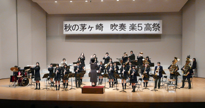 | 藤沢清流高校も加わり、写真のように起立演奏(という呼び方でいいのかな?)もあり、視覚的にも楽しい演奏でした。 トップバッターだから、ちょっと緊張していたようにも見えましたが、前顧問の“おちゃめ”渡辺良子先生がホルンで参加するなど、持ち味は出せたステージでした。 |