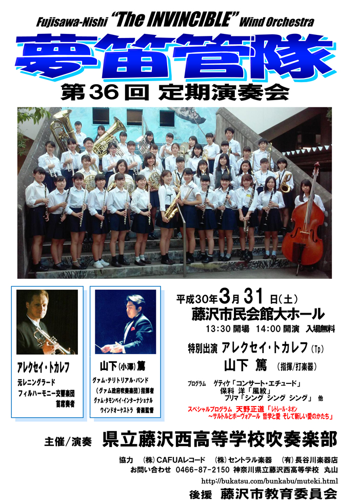 神奈川県立藤沢西高等学校吹奏楽部『夢笛管隊』 Fujisawa-Nishi “The INVINCIBLE” Wind Orchestra 第36回定期演奏会 日時 平成30年3月31日(土) 13:30開場 14:00開演 (入場無料) 会場 藤沢市民会館大ホール 特別出演 アレクセイ・トカレフ(Tp) 山下 篤(指揮/打楽器/MC/他) プログラム(予定) ゲティケ 「コンサート・エチュード」 保科 洋 「風紋」 プリマ 「シング シング シング」(夢笛管隊バージョン) マンジョーネ 「サンチェスの子供たち」 久石 譲 「となりのトトロ」メドレー 他 スペシャルプログラム 天野正道 「レトレ・ル・ネオン サルトルとボーヴォアール哲学と愛 そして新しい愛のかたち」 主催/演奏 県立藤沢西高等学校吹奏楽部 後援 藤沢市教育委員会 協力 (株)CAFUAレコード (株)セントラル楽器 (有)長谷川楽器店 お問い合わせ 0466-87-2151(職員室直通) 神奈川県立藤沢西高等学校 丸山 演奏会のプログラムを決める時にいつも困るのが「前にやったことがあるから」「コンクールで有名になったから」さらに「一度演ってみたかったから」…となると、結果としてどこの演奏会でも似たような曲が並ぶことになります。「このバンドのこのメンバーでこの曲…聴いてみたーいっ!!」というプログラムの何と少ないことか…。 ポスターやチラシを見て気になることもあります。クラシックや吹奏楽オリジナルは「○○作曲、△△の◇◇」と丁寧に紹介しているのに、その下に「ポップスコーナー」…ジャズもロックもラテンもひとくくり?よくこんな失礼なことができるなー?…と思っているのは私だけのようですが(笑)。 いまだに吹奏楽よりオーケストラの方が格が上だという感覚も残っているようですが、私は吹奏楽ってスゴイと思います。オーケストラ編曲、吹奏楽オリジナル、ジャズ、ラテン、ロック、何でもできます。ドラムセット、エレクトリック・ベース、様々なパーカッション、どんな楽器との組み合わせも可能です。 今回もトカレフさん、山下さんをお迎えして、『夢笛管隊ならでは』の演奏をお楽しみいただきたく存じます。3月最後の土曜日の午後、ご来場くださった皆様に『無敵の時間』をお贈りできますよう、一同練習を重ねてまいります。 お知らせその1 3月27日(火)午後、米ウィスコンシン州からミドルトン高等学校吹奏楽部とアレン・ヴィズッティさん(Tp)が来校されます。関係者のみの交流演奏会となりますが、見学ご希望の方は藤沢西高校(丸山)まで事前にご連絡ください。 お知らせその2 第37回定期演奏会は、平成31年3月30日(土)に藤沢市民会館大ホールにて開催させていただくことになりました。皆様のご来場を心よりお待ちしております。 |