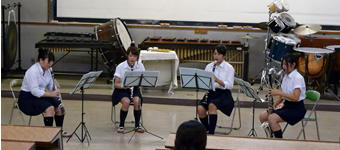 | 管理人「今年から丸山先生が来られて、変わった点はありますか?」 松本さん「合奏中にロングトーン大会が始まって、優勝するとお菓子のご褒美が出るようになりました(笑)。あと、合奏内容が濃くなって、うまくなっているという感じがします。いろいろと喩えを言ってくれて、それが適切ですし。」 管理人「コンクールに向けての抱負を。」 佐藤楓さん「ホルジンガーは演奏していてドキドキ感があります。そのドキドキを聴いている人たちにも伝えられるような演奏をしたいです。」 佐藤芙湖さん「やるからには金賞を。上に行こうという気持ちはあります。お客さんに楽しんでもらうために、自分たちも楽しむ、という意識は持ちたいですね。」 管理人「では、これから進路を決める中学生にメッセージをお願いします。」 佐藤楓さん「お互いに悪い点は指摘し合える、先生とも意見の言い合えるいい雰囲気の部活です。是非。」 佐藤芙湖さん「私自身が、ヘタ過ぎず、かと言って厳しすぎず、楽しく音楽が出来そうな学校ということで藤沢西を選びました。いい雰囲気で、楽しく音楽をやりたいなら、藤沢西です。」 松本さん「吹奏楽に限らず、生徒は明るく元気で仲のよいのが伝統です。行事もいっぱいあって楽しいので、是非見学に来てネ。」 ありがとうございました。 コンクールでの活躍を祈ります。 |